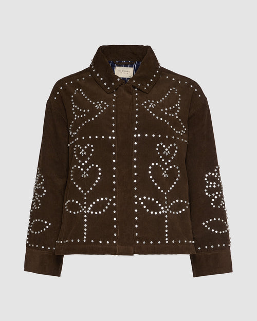 • Short, boxy jacket made in leftover cotton baby corduroy and embellished with rhinestones.