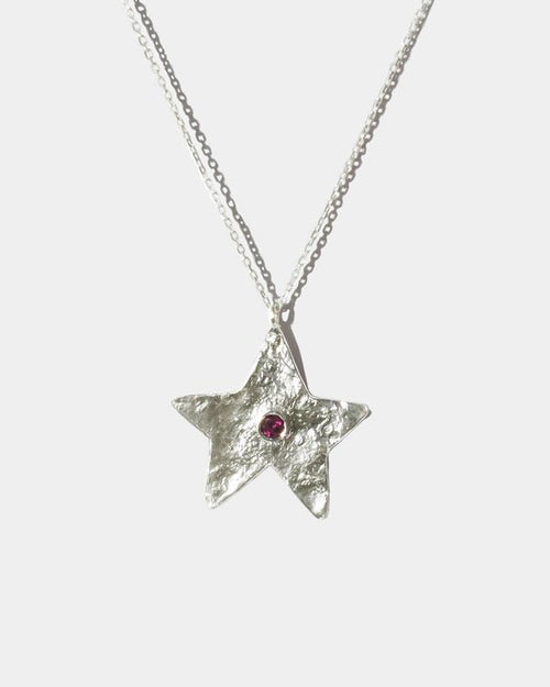 Rugged texture star amulet embellished with natural pearls (gold version) or natural rhodolite (silver version).