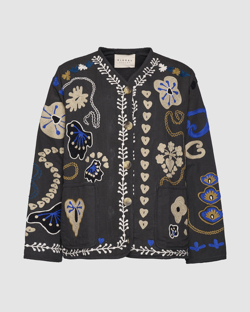 - Cotton canvas jacket, adorned with Suzani embroidery is placed all over, featuring flowers, hearts, and other beautiful symbols.