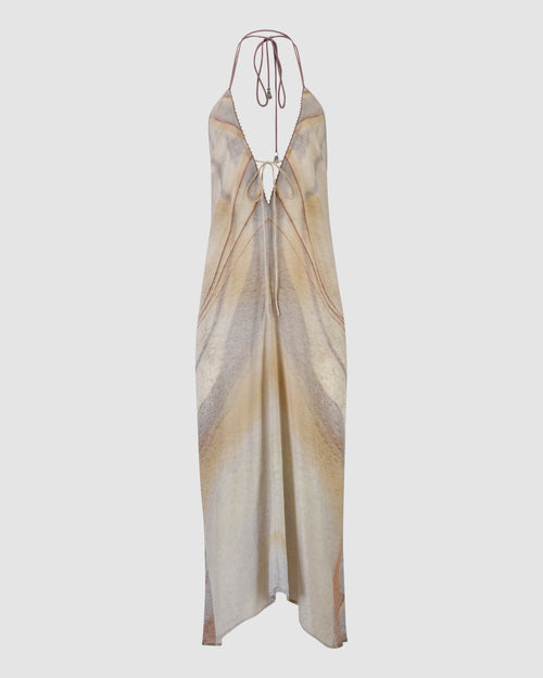 • Asha dress in Fog. The White Raven is a collection of limited-edition hand-crafted pieces, combining ancient textile arts with modern design. It is inspired by generations of culture, art and knowledge passed along lineages and shared throughout time. The brand uses hand loom-weaved raw silks and delicate cottons, hand embellished with block-printed details that cast in predominately natural dyes and set with ancient dying techniques. It's creation process can take up to 6 months to complete and creates unique variations in each garment, leaving a signature of irregularity and life's beautiful imperfections in each piece.