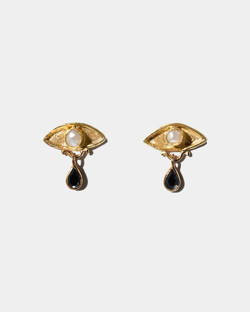 - Irregular eye shaped stud earrings adorned with freshwater pearls and iolite teardrop gemstones.