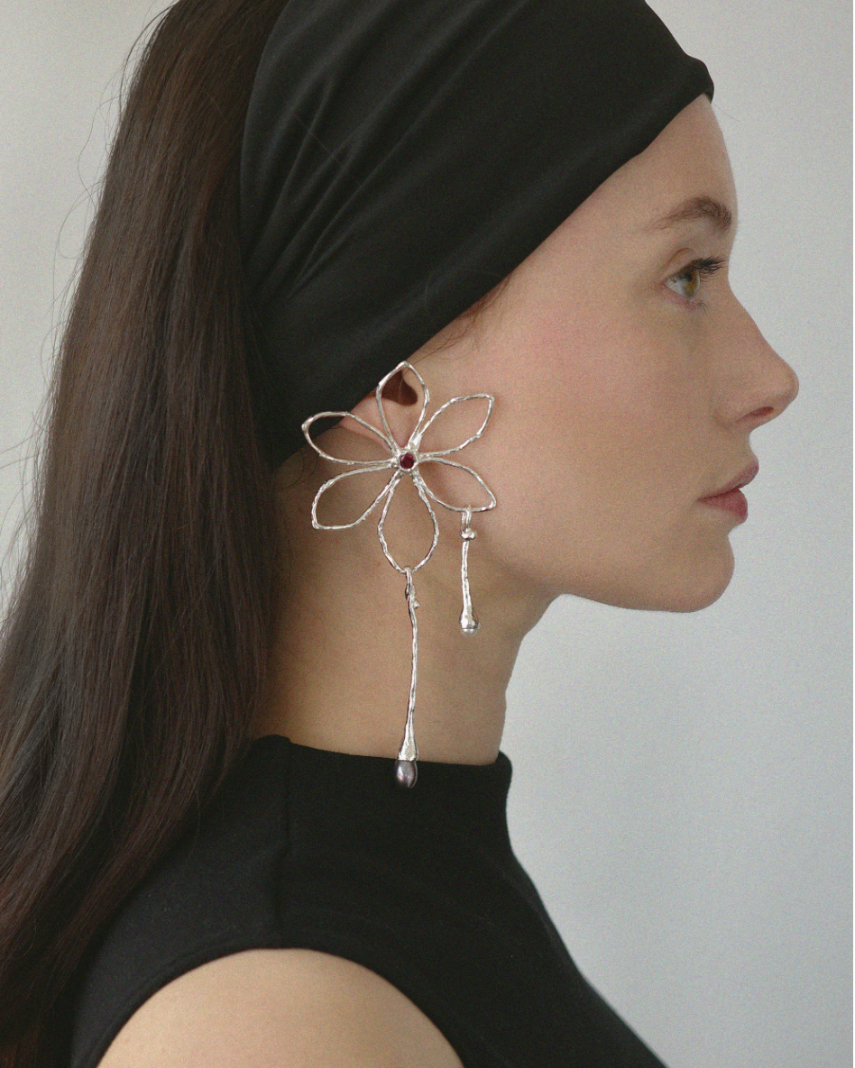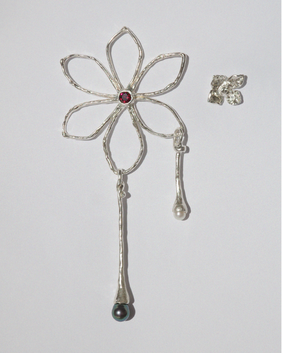 Irregular shape flower stud adorned with rodolithe (pink garnet) and melted pendant set with blue and white freshwater pearl.