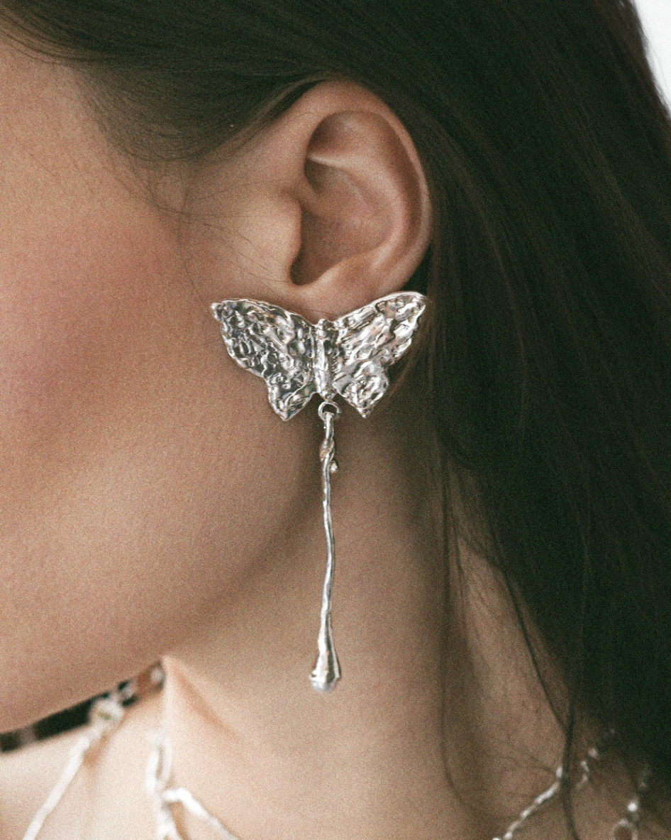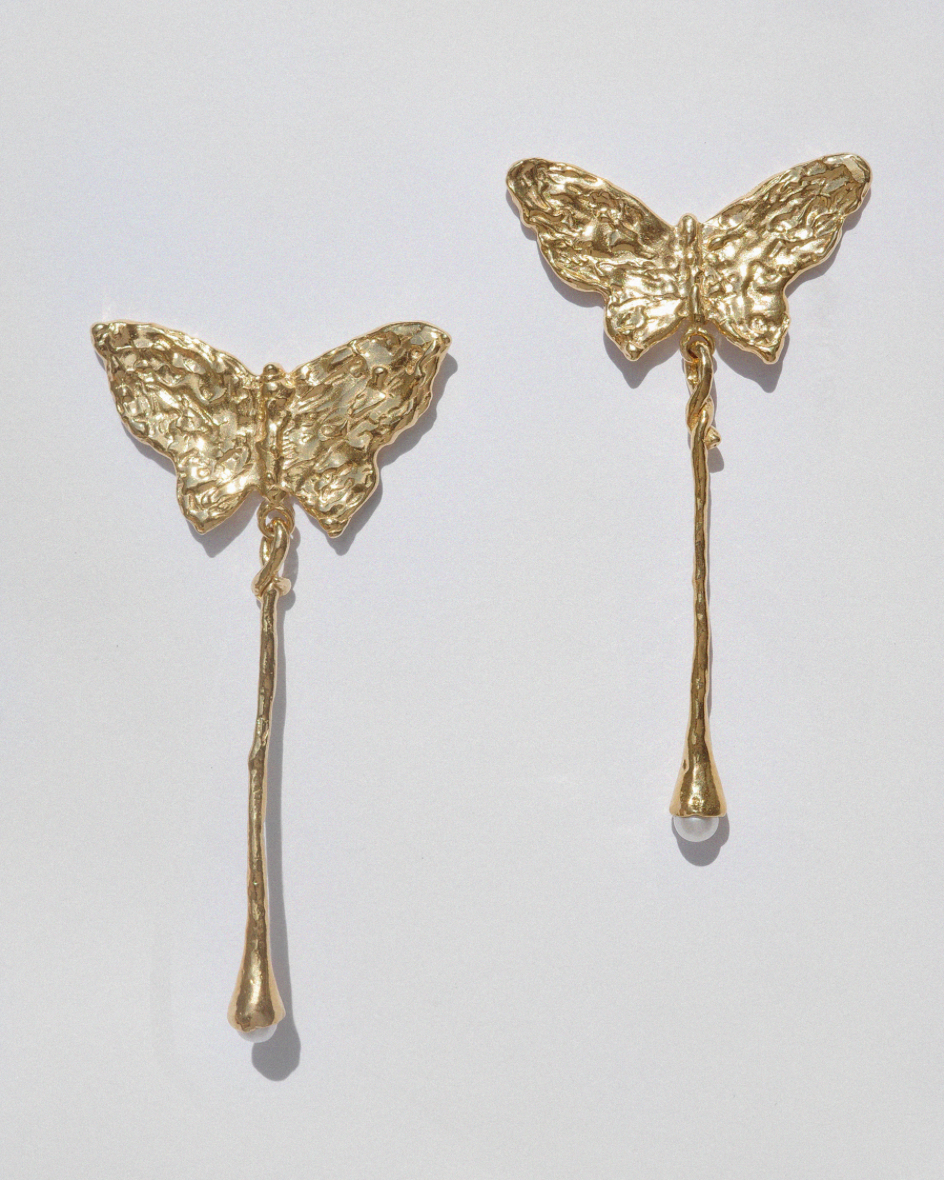 Irregular shape butterfly stud set with melted pendant set with freshwater pearl.